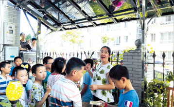 Ni Huan (second right) explains to a group of young visitors how her solar power system works.