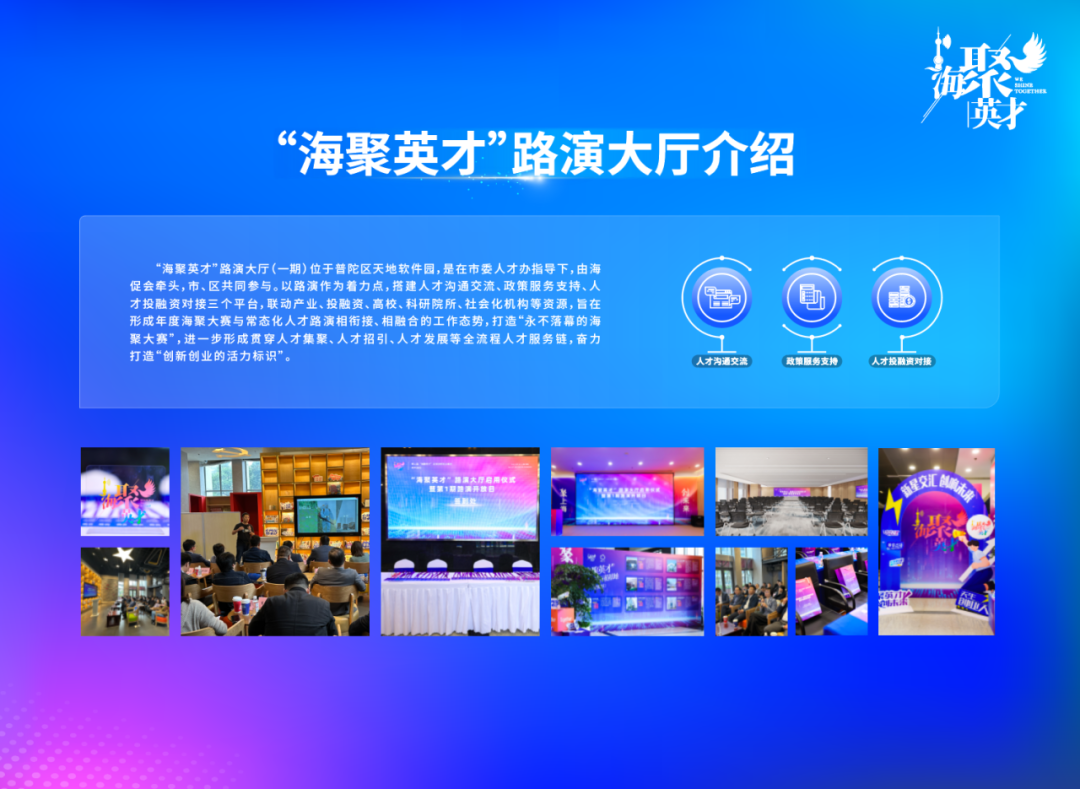 “海聚英才”路演大厅(一期)位于普陀区天地软件园,是在市委人才办指导下,由海促会牵头,市、区共同参与。以路演作为着力点,搭建人才沟通交流、政策服务支持、人才投融资对接三个平台,联动产业、投融资、高校、科研院所、社会化机构等资源,旨在形成年度海聚大赛与常态化人才路演相衔接、相融合的工作态势,打造“永不落幕的海聚大赛”,进一步形成贯穿人才集聚、人才招引、人才发展等全流程人才服务链,奋力打造“创新创业的活力标识”。