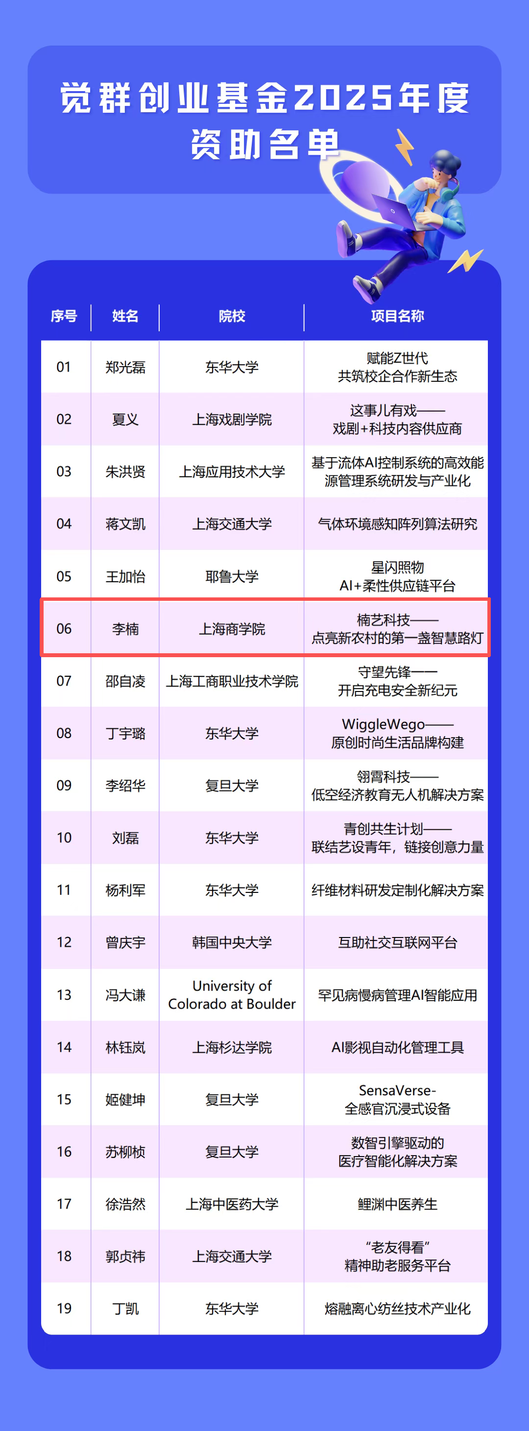 近日,星海创立方入驻大学生创业项目“楠艺科技一点亮新农村的第一盏智慧路灯”获2025年度上海市慈善基金会“觉群创业基金”资助。