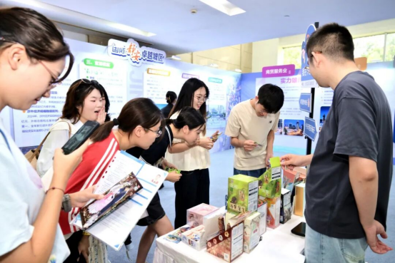 年轻学子在青年城区展位前纷纷打卡,领取含有静安元素的透卡、斜挎包、手账本等精美礼品;静安区人才局、公务员局围绕选调咨询、人才政策咨询设置展台,更是将静安区党建服务中心“搬”到双选会现场,力求使学子获取“快人一步、原汁原味”的资讯干货。