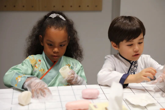 小朋友们更是兴致勃勃,玩得十分开心。虽然沾了满脸的面粉,但刚刚完成制作的柏子亦还是兴高采烈地向大家展示她的成品,“我今天第一次做月饼,感觉很好玩,印的是我最喜欢的兔子。”