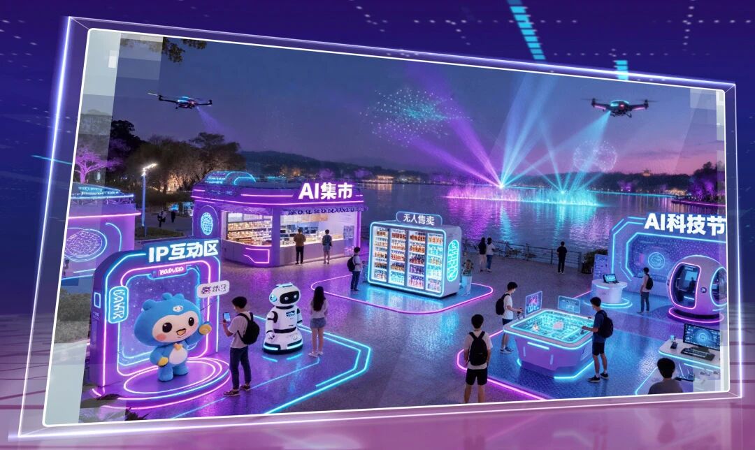 该项目通过昼夜分时运营,白天提供增强现实、AI艺术长廊及心境剧场等科技艺术体验;夜间则利用裸眼3D、光影水幕和无人机表演营造沉浸式文旅秀场。同时依托常态化科技活动、IP互动空间及AI集市运营,构建线上线下联动的娱乐体验平台。整体场景以AI为核心纽带,贯穿消费、体验、创作和互动,最终打造集科技娱乐与文化体验为一体的文旅地标,树立全国智能文旅场景的标杆。