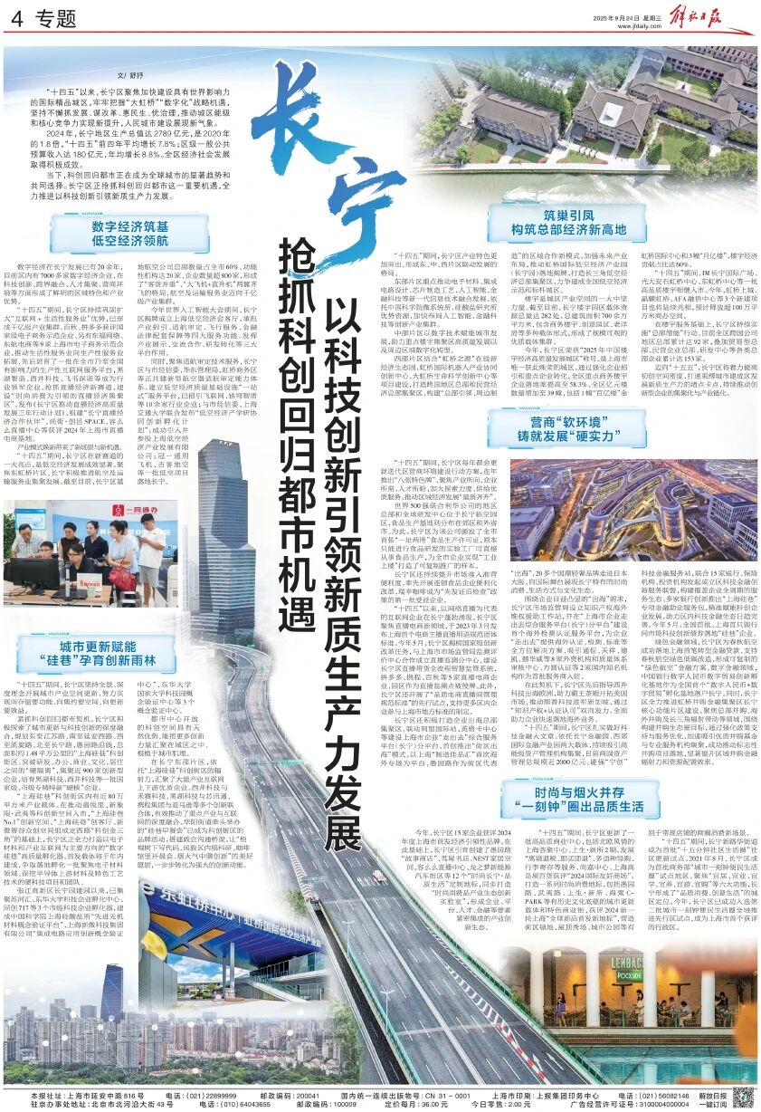 9月24日,《解放日报》以《长宁 抢抓科创回归都市机遇 以科技创新引领新质生产力发展》为题在第4版进行专版报道:“十四五”以来,长宁区聚焦加快建设具有世界影响力的国际精品城区,牢牢把握“大虹桥”“数字化”战略机遇,坚持不懈抓发展、谋改革、惠民生、优治理,推动城区能级和核心竞争力实现新提升,人民城市建设展现新气象。