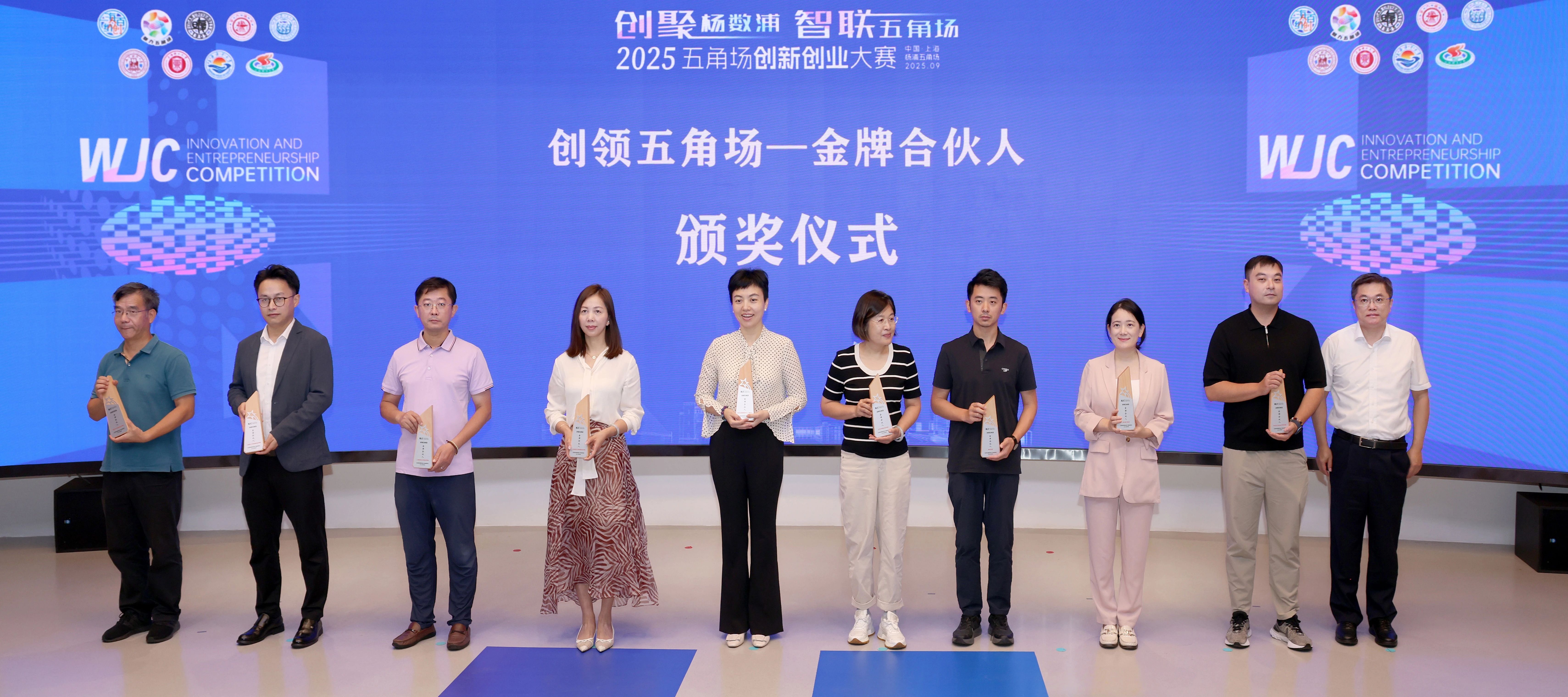 薛侃为在历次大赛中给予充分支持、推进密切合作的高校、孵化器及投资机构等单位代表颁发“创领五角场一金牌合伙人”奖项。