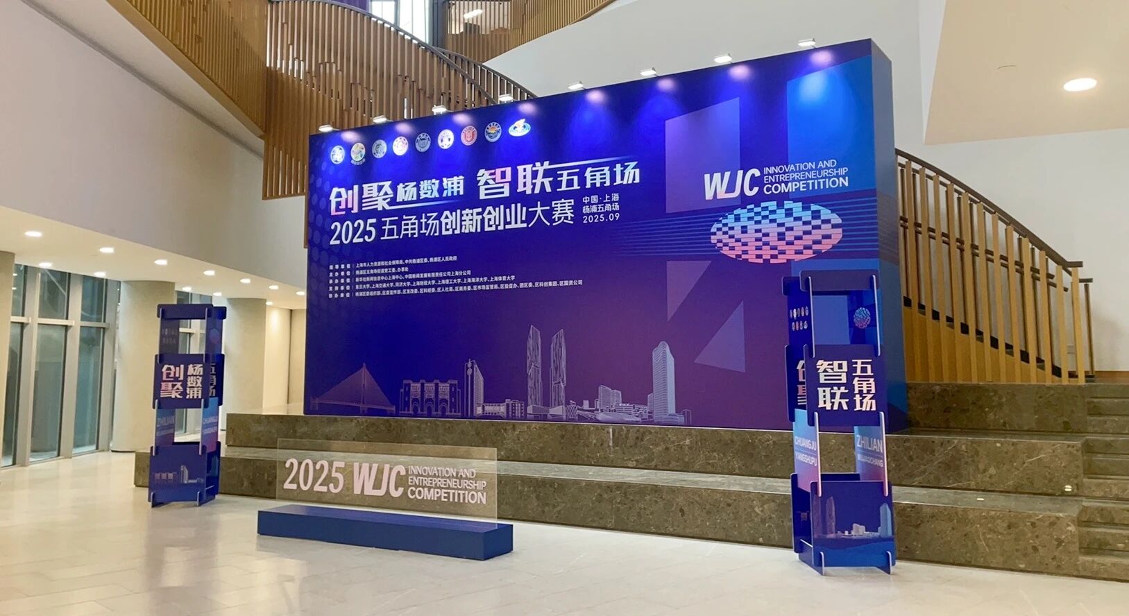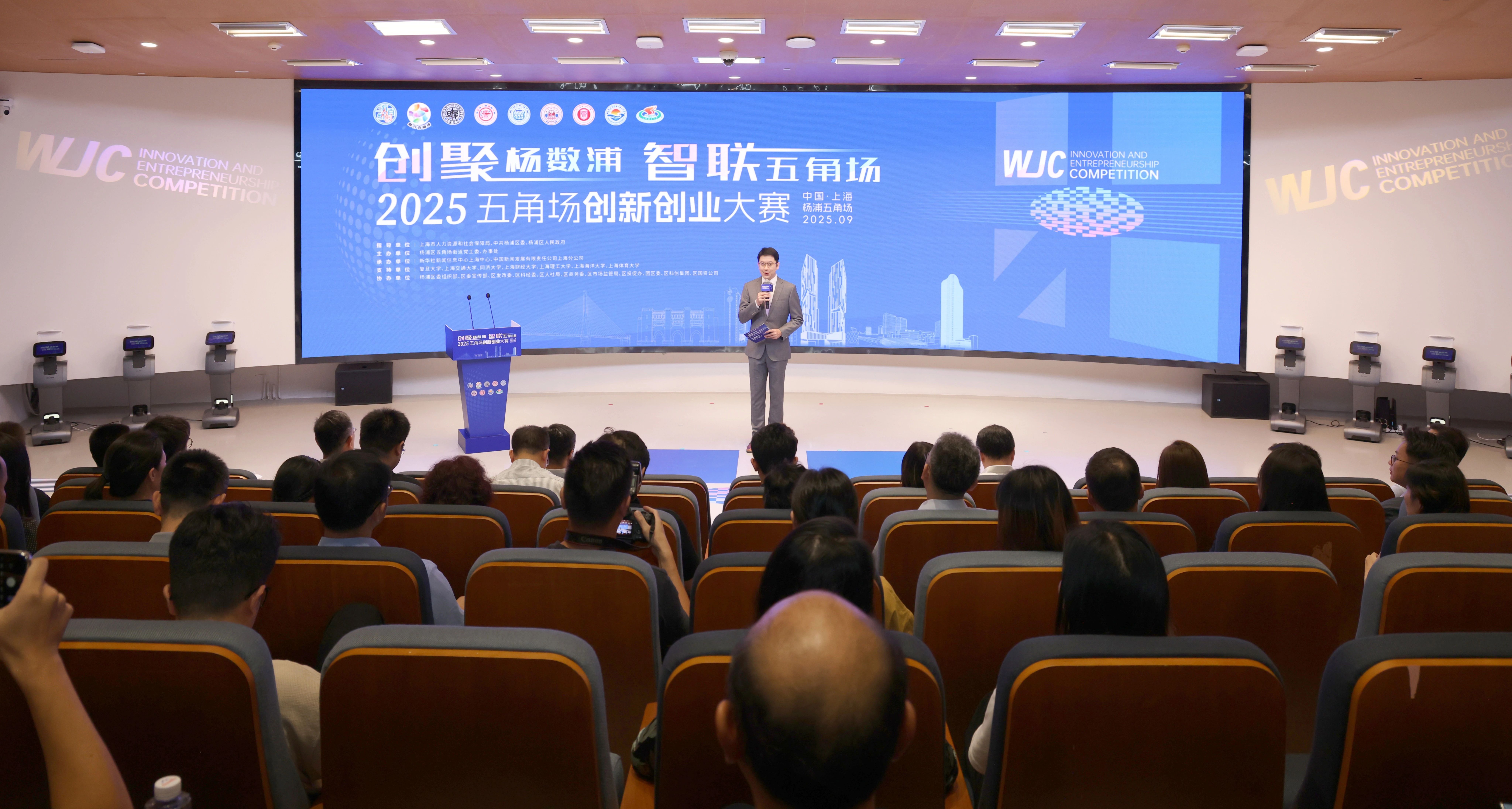 活动现场,杨佳瑛、薛侃、王永前、周磊、刘莉亚、尼冰等共同开启2025五角场创新创业大赛的征程。
