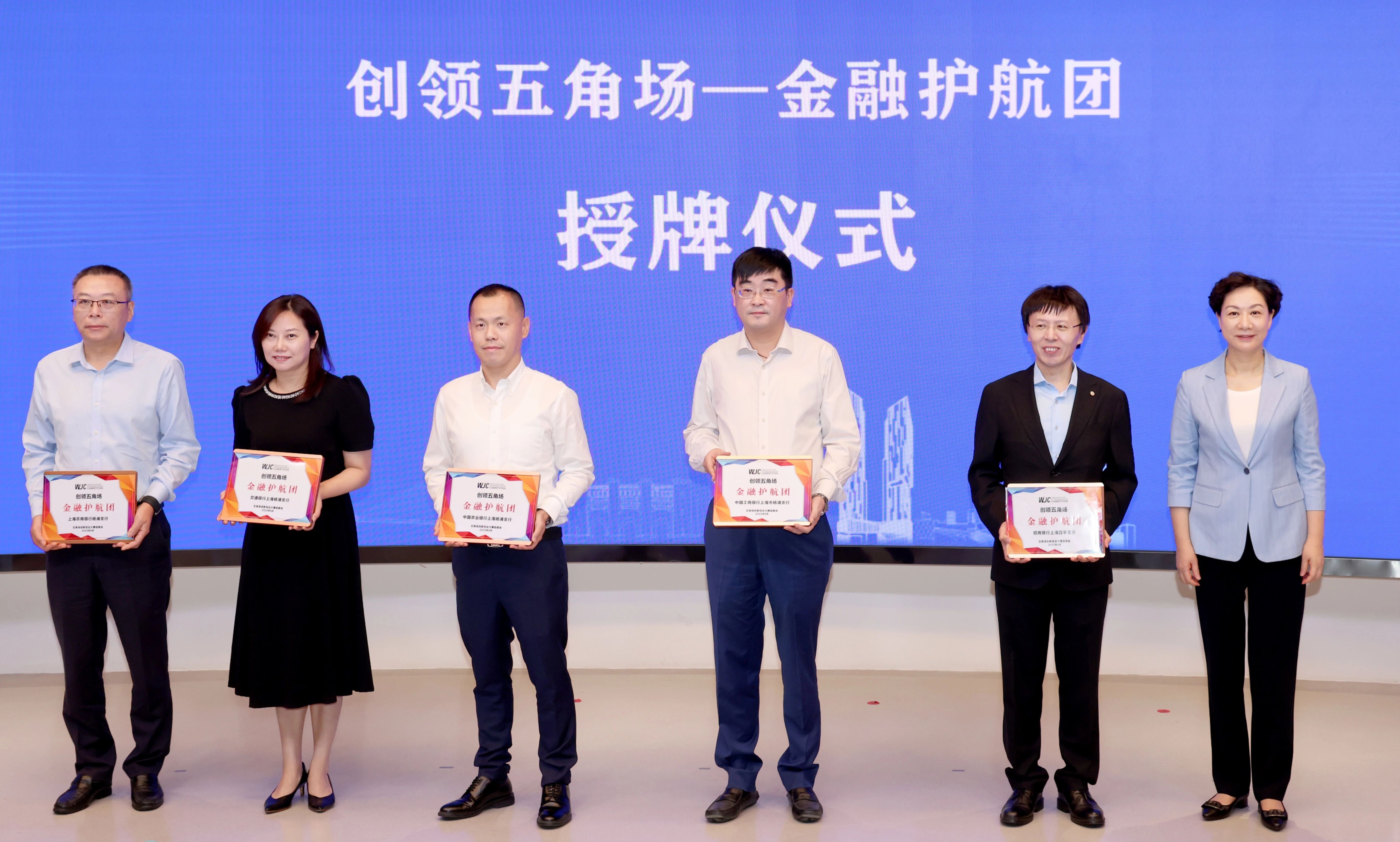 杨佳瑛为由银行、投资、保险等金融机构组成的“创领五角场一金融护航团”代表授牌。现场发布“金融护航团”为大赛定制的特别金融产品,为创业者提供“政策+资金”双重赋能。