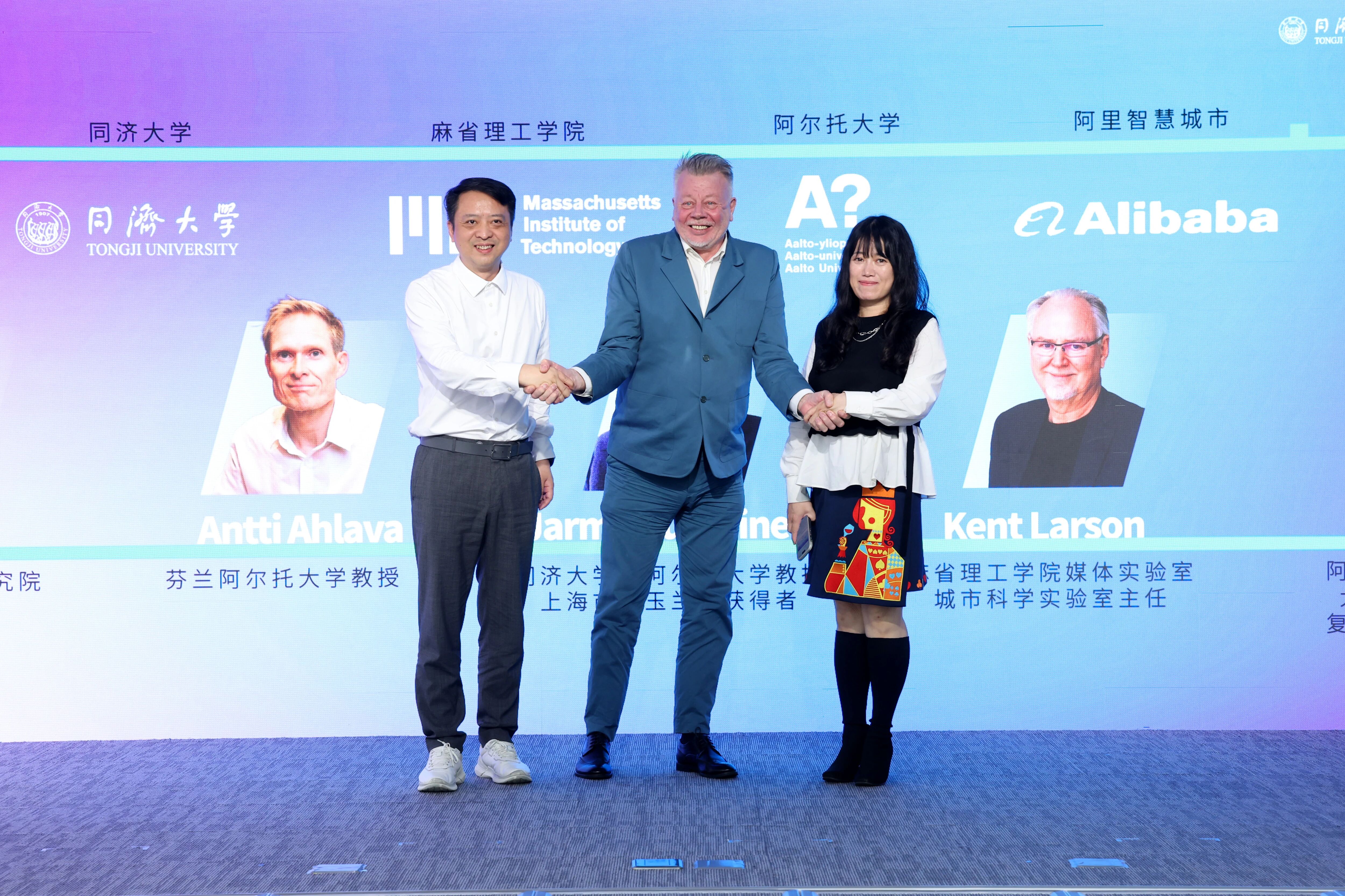 同济大学及阿尔托大学教授Jarmo Suominen、上海国际设计创新研究院院长苏运升、阿里云智能集团时空大模型产品负责人陈怡星共同启动《复兴岛量子城市:杨浦滨江人机共创装置》全球首展。