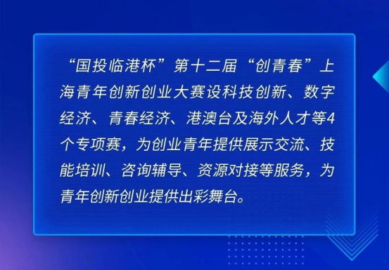 团市委介绍,第十二届“创青春”上海青年创新创业大赛现已开始报名。本届赛事设科技创新、数字经济、港澳台及海外人才四个专项赛,报名渠道及项目设置、参赛资格等详见↓
