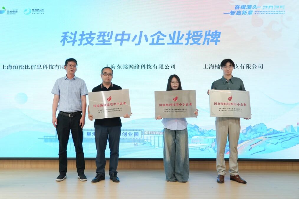 活动为获评“2025年国家级科技型中小企业”的企业上海泊松比信息科技有限公司、上海楠艺科技有限公司、上海东棠网络科技有限公司授牌。
