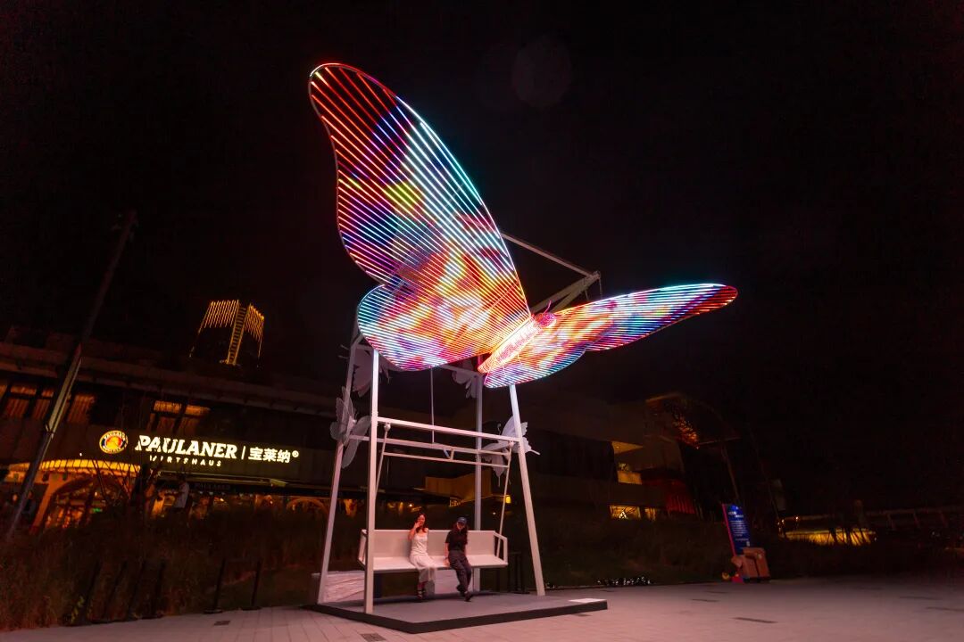 李炎介绍说,以《光之翼》为例,该装置结合徐汇滨江“生态优先”的规划理念,以“蝴蝶”这一自然意象为灵感,将互动装置融入城市休憩空间。既满足市民Citywalk时的松弛需求,唤起美好体验,又巧妙延长用户在梦中心的停留时间——停留越久,越容易发现周边商业的精彩,从而间接促进消费转化。在这里,功能性与艺术性不再割裂,而是共同诠释“徐汇式理想生活”的松弛感。“坐上秋千后,随着游客的摇摆,蝴蝶仿佛会扇动翅膀,非常适合情侣和亲子家庭体验。”