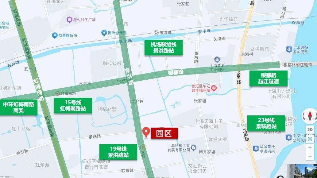 园区的区位优势实属“硬核”十足。直达地铁15号线虹梅南路站,未来更有在建的23号线景联路站和19号线景洪路站,彼时三条轨交线路交织覆盖。更令人心动的是,依托机场联络线,从这里出发,15分钟即可直达虹桥国际机场,25分钟到浦东国际机场,前往上海南站仅需20分钟,到虹桥高铁站也只要半小时左右。周边公交线路极为丰富,闵行14路、闵行22路、梅陇1路、157路等十余条线路四通八达。
