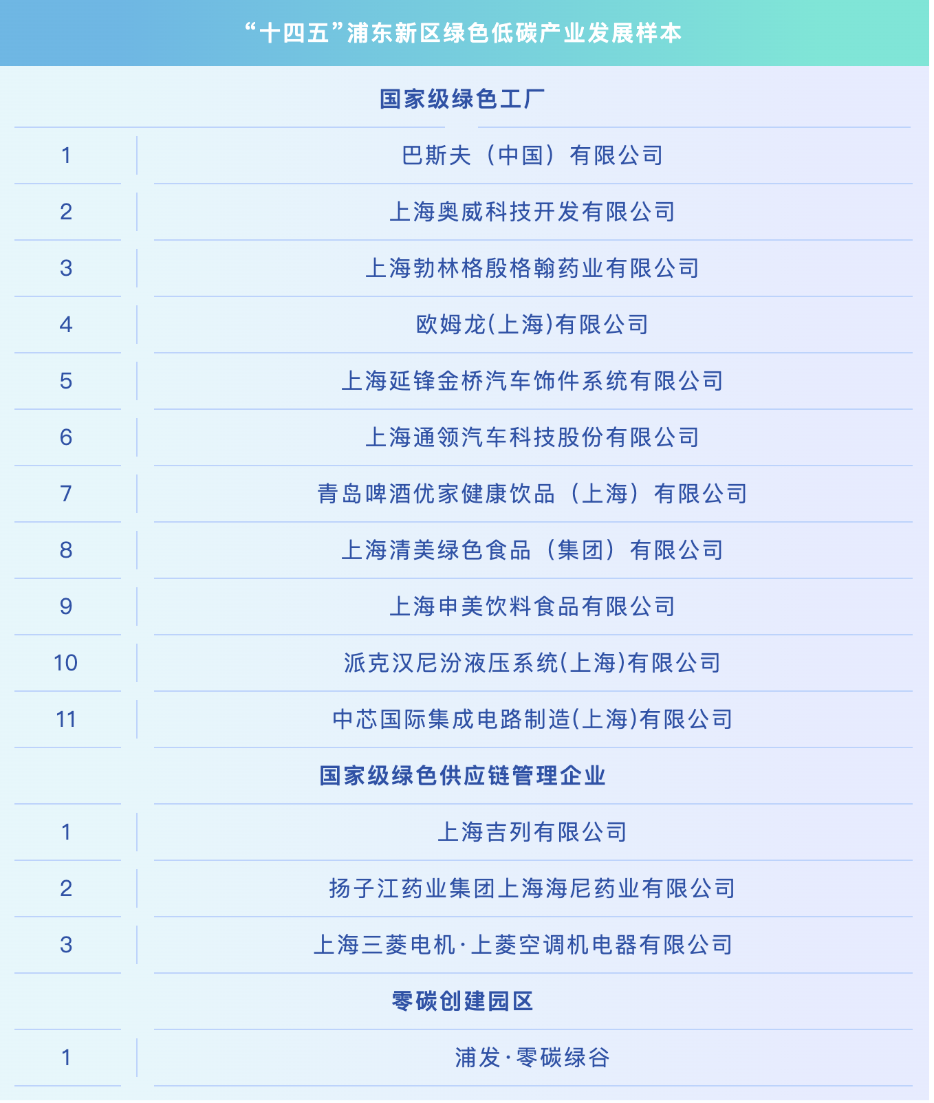 同时,大会发布了“十四五”浦东新区绿色低碳产业发展样本。15个发展样本涵盖11家获评国家级绿色工厂的企业、3家国家级绿色供应链管理企业和1个零碳创建园区。(详见文末)