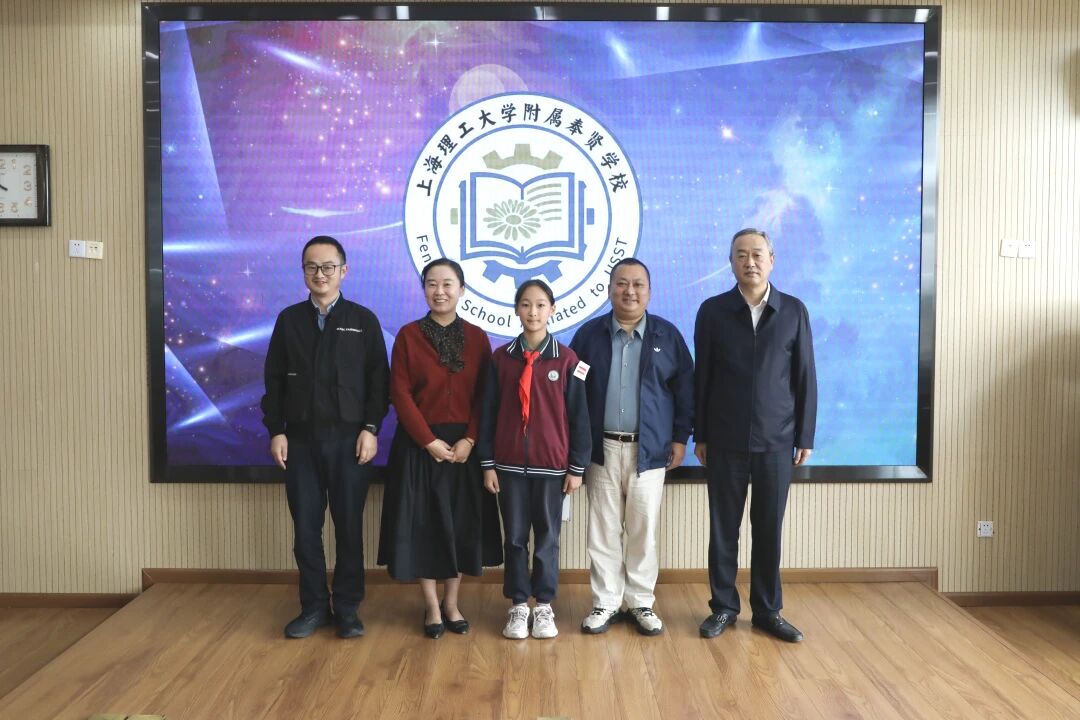 黎卫、程立春、陶建兴、汤连华以及学生代表共同发布上海理工大学附属奉贤学校新校徽。
