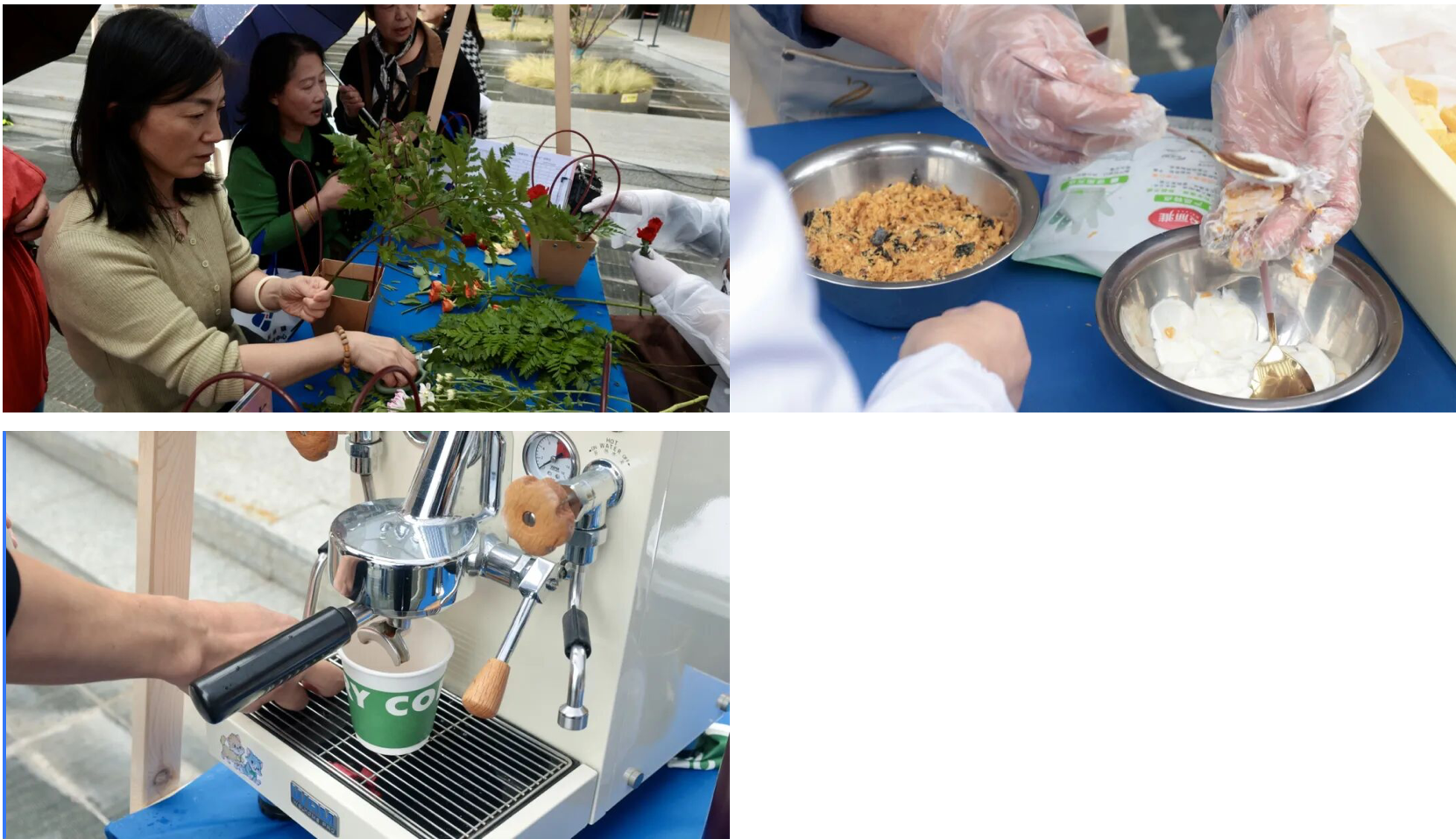 最受大家欢迎的当属“职业技能体验”摊位。活动现场分别设有插花师、西点师和咖啡师3种不同的特色体验专区,每个专区前都围满了跃跃欲试的群众。老师现场示范教学,从插花的色彩搭配、西点的塑形技巧到咖啡的拉花手法,一步步细致讲解、手把手指导。大家认真聆听、亲手实操,在沉浸式体验中感受职业技能的魅力,现场氛围热烈又充实。