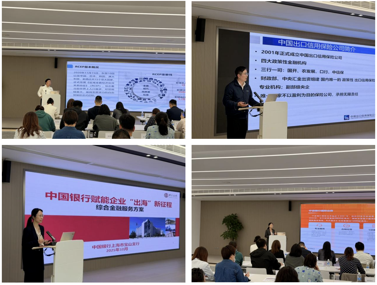 吴淞海关综合业务科帮助企业把握RCEP协定下的关税优惠与市场机遇,同时提示了出口管制要求,为提升通关效率、降低合规风险提供了清晰指引。中信保市北营业部则对出口信用保险政策进行了深入解读,帮助企业化解海外商业与政治风险,让企业能够更加安心地开拓市场。中国银行宝山支行交易银行部与宁波银行上海分行业务部门代表从跨境结算、汇率风险管理到利用大数据平台进行精准海外营销,全面展示了金融科技如何为企业出海提供强有力的资金保障与拓客支持。