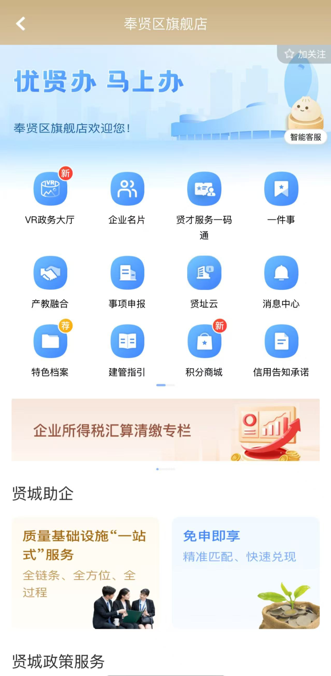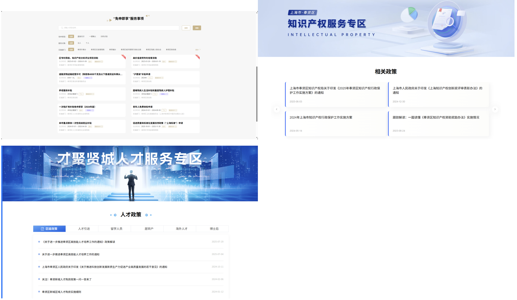 奉贤区着力打造“线上惠企服务专区”,依托“一网通办”PC端——奉贤区企业专属空间和移动端——“随申办”企业云奉贤区旗舰店,汇集了“政策体检”“精准政策推送”“随申兑·惠企政策精准服务平台”“免申即享”“知识产权”“人才服务”等功能,通过整合政策资讯、服务应用、惠企资源,为企业提供高效、便捷、贴心的线上服务,持续提升企业办事便利度和获得感,助力优化我区营商环境。