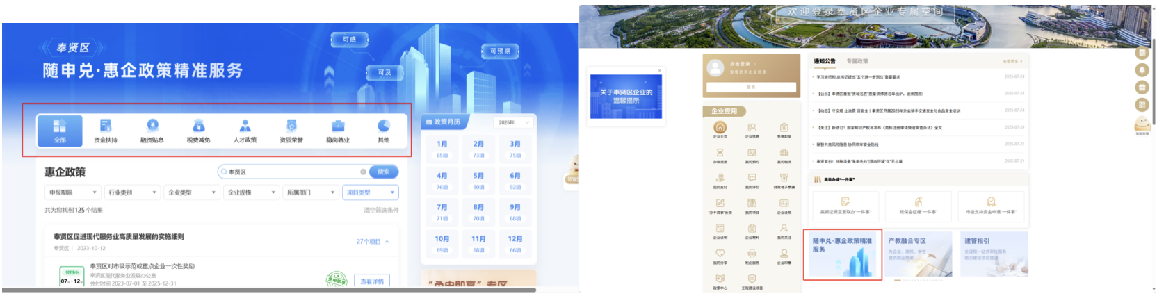 进入“奉贤区企业专属空间”→点击进入“随申兑·惠企政策精准服务平台”