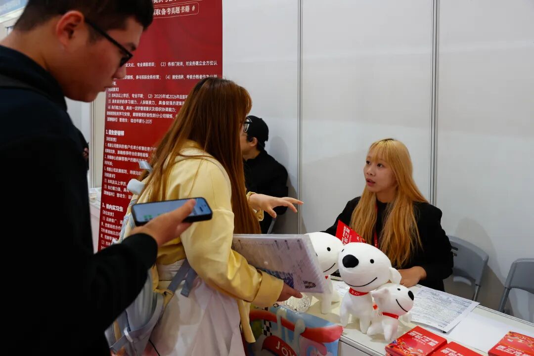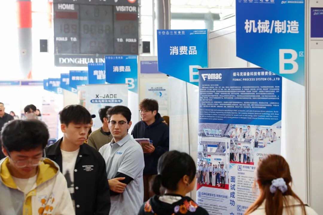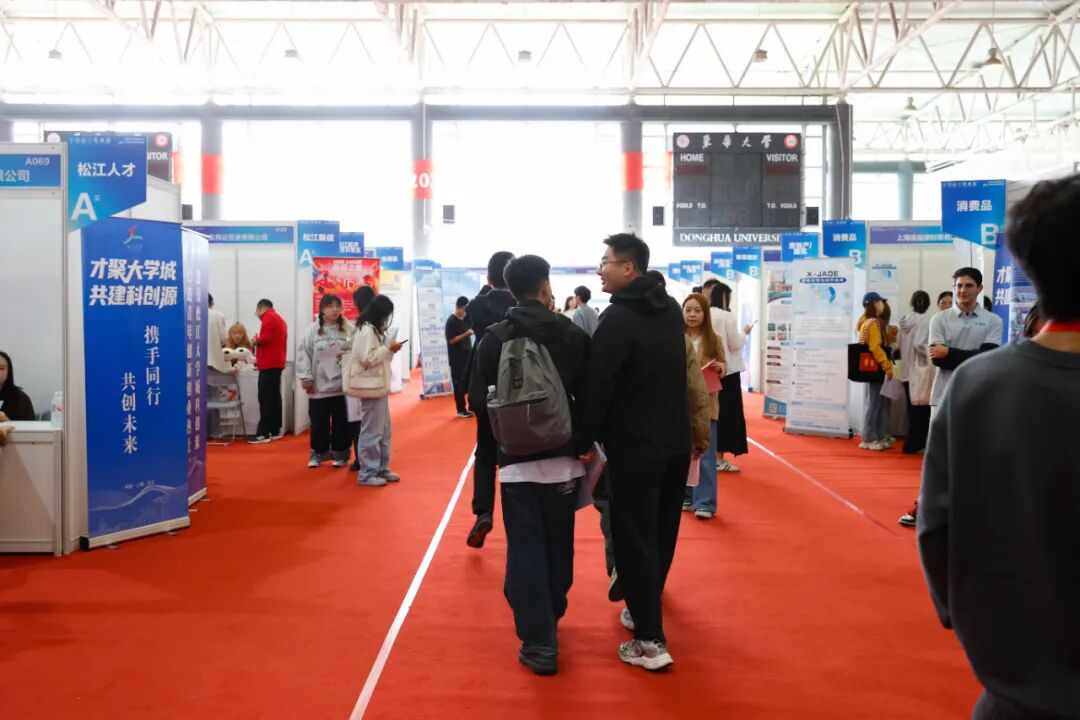 招聘会现场,东华大学、上海外国语大学、华东政法大学、上海工程技术大学、上海对外经贸大学、上海立信会计金融学院、上海视觉艺术学院、上海科创职业技术学院、上海农林职业技术学院等高校的求职者和就业部门悉数到场,气氛热烈、人头攒动。