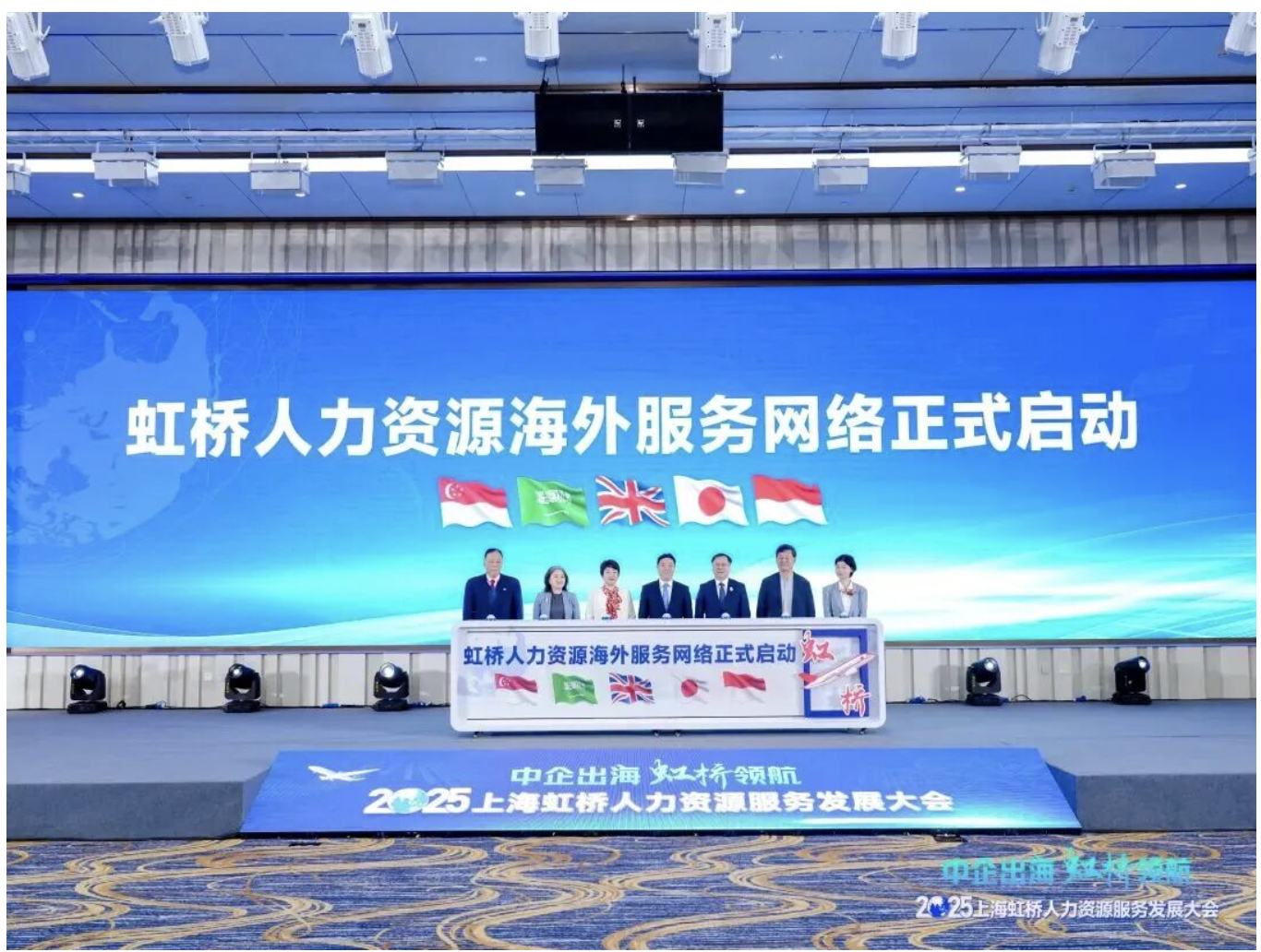 大会还举行了“虹桥人力资源海外服务网络”启动仪式。该海外服务网络聚焦构建关键出海目的地的服务链条,标志着虹桥人力资源服务从“国内枢纽”向“全球节点”转型。该网络首批在英国、沙特、日本、新加坡、印度尼西亚设立服务站点,覆盖欧洲、中东、东亚、东南亚四大中企出海核心市场,将为闵行区出海企业提供本地化、前置化的人力资源服务保障。