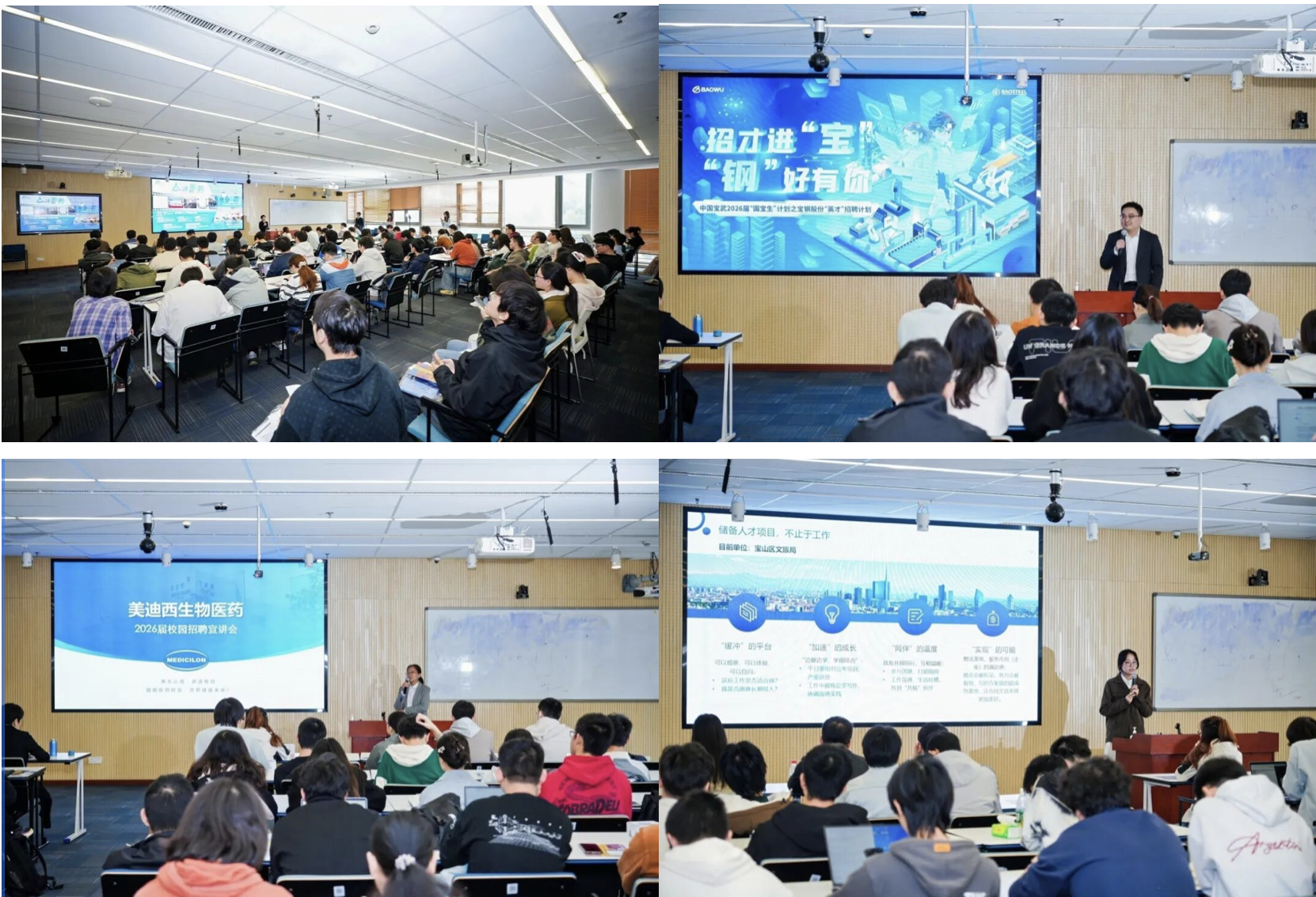 宣介会上,宝山区以政策解读与标杆推介为双轮驱动,全面彰显对青年人才的重视程度与区域产业的蓬勃活力。政策解读环节,区人才工作局围绕青年储备人才培育体系,系统介绍了涵盖入门扶持、安居保障、职业晋升与创业赋能的全周期支持举措。这一系列政策与宝山区青年人才发展“伴飞”计划形成政策合力,从人才落地之初便提供安心保障与成长舞台,让青年人才切实感受到宝山引才、育才、留才的满满诚意。企业宣介环节,特邀宝钢股份、美迪西生物两家重点企业登台推介,作为传统产业升级的领航者与新兴产业的领军力量,两家企业的多元组合,立体呈现了宝山多元化、高质量的产业发展格局,更向在场学子传递关键信号:宝山已构建适配不同专业背景青年人才的发展生态,能为各类人才提供施展才华的广阔平台。