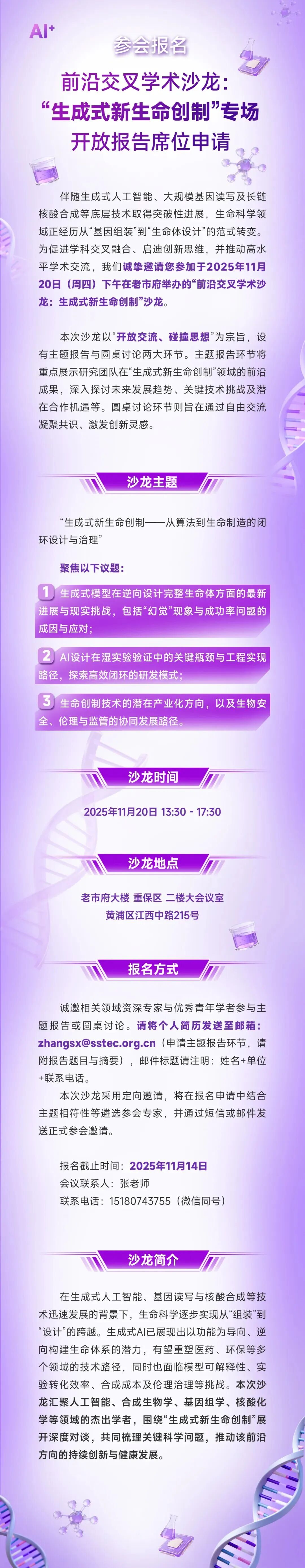 黄浦|前沿交叉学术沙龙“生成式新生命创制”专场开放报告席位申请→