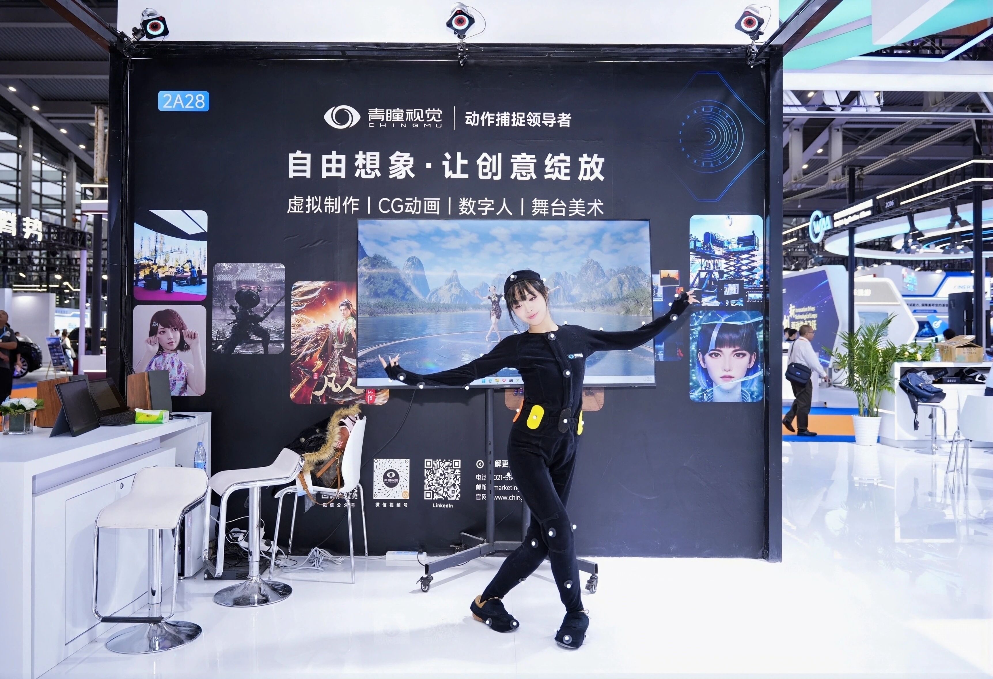 带来了目前市面上最为精准的红外光学动作捕捉技术。展区内,身着特制服装的舞者翩翩起舞,服装上精准分布的53个反光标记点随着舞姿灵动变化,屏幕上的数字人完全同步复现着舞者的每一个动作。这项技术以其高精度、低延迟和优异的实时性为主要特点,能够精细捕捉五个指尖的微妙运动轨迹,将动作制作效率提升数倍,适用于对数据准确性要求高的科研、医疗、动画制作等领域。