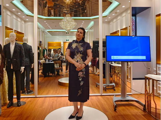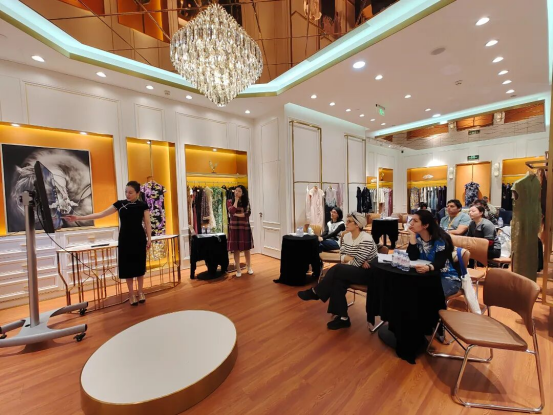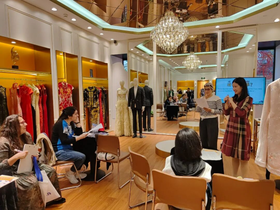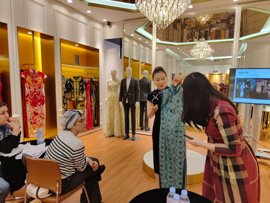 “制作旗袍需要68道工序,其中8道工序是最重要的。”课堂上,蔓楼兰的工作人员介绍了旗袍的起源、历史和制作工序,并以店铺内展示的旗袍为范本,向外籍人才们细致讲解海派旗袍的历史渊源、工艺特点与文化内涵。从盘扣的传统工艺技法,到不同面料的运用,再到旗袍的搭配技巧,工作人员的讲解生动有趣,还邀请外籍人才触摸面料、观察盘扣细节,让大家对旗袍的认知从“视觉欣赏”转向“触觉感知”。