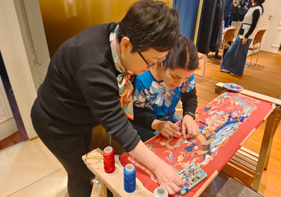 现场,来自伊朗的纱哈耶(Shaghayegh)还在工作人员的指导下一针一线仔细地绣着旗袍上的图案,娴熟的指法引得在场人员啧啧称奇。