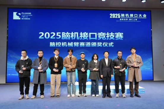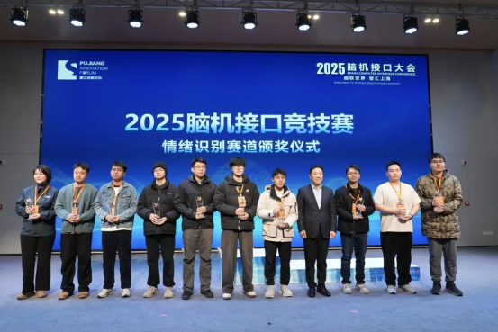 王茤祥、市药监局副局长郭术廷、市卫生健康委二级巡视员吴宏为“2025全国颠覆性技术创新大赛脑机系统锦标赛”获奖团队颁奖