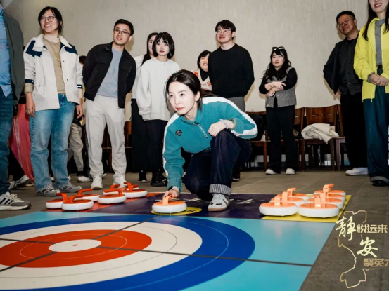 随后的旱地冰壶竞技将现场气氛彻底点燃。在专业教练指导下,四支队伍积极投入角色分工、排兵布阵,在积分制比赛中展现出策略思考与协作精神。每一次精准推壶、每一次战术调整,都伴随着掌声与喝彩。最终获胜的队伍共同举起奖杯,手捧奖杯的瞬间,集体荣誉感自然凝聚。冰壶竞技所体现的“谋定而后动”与团队执行力,也成为大家延伸至专业领域的共同启发。