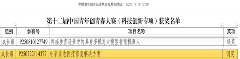 由共青团中央、商务部、国家卫生健康委、税务总局等单位联合有关省级政府共同主办的第十二届中国青年创青春大赛结果近日公布。经松江团区委推荐并指导,由上海昇视唯盛科技有限公司首席技术官杨展烨负责的“焊接垂直场景中的具身多模态大模型智能机器人”项目,斩获全国成长组银奖;由颢箔医疗科技(上海)有限公司创始人黄晶焕负责的“创新紧急医疗修复解决方案”项目,斩获全国成长组铜奖。