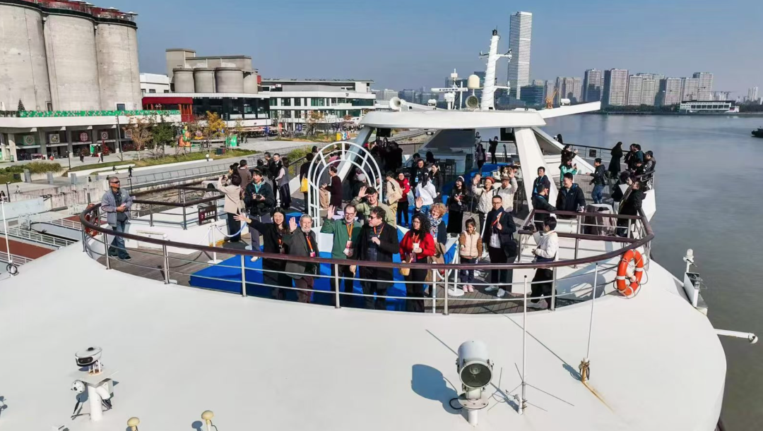 来自全球各地的诗人在游船上观赏浦江两岸风景