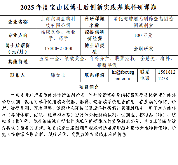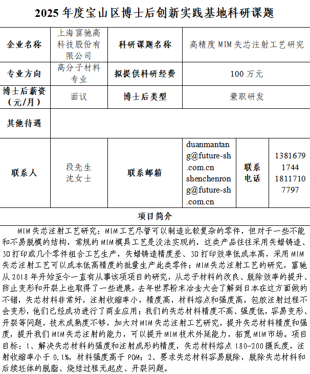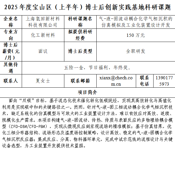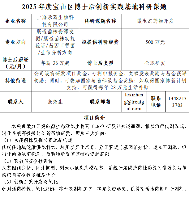 为进一步发挥博士后制度优势,有效推动我区企业开展科技攻关与产学研合作,宝山区人才工作局按照“2+N”模式,在2025年度宝山区博士后创新实践基地科研项目的征集活动基础上,经专家评审,并征求企业意见,本次区内共推出先进材料、生物医药、新一代信息技术等在内6个博士后科研项目及配套待遇,诚挚欢迎海内外高层次青年科研人才踊跃揭榜!具体情况如下: