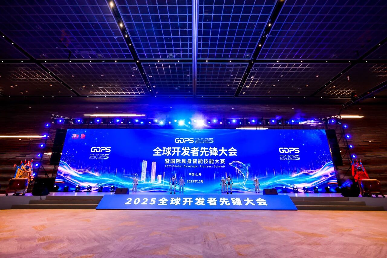 2025年12月13日上午,上海张江科学会堂内光影交错,科技氛围浓厚,全球开发者先锋大会暨国际具身智能技能大赛(GDPS 2025)开幕式隆重举行。