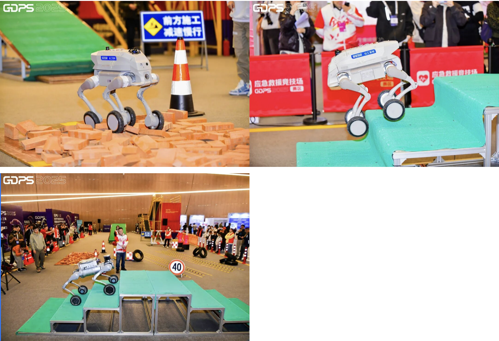 在模拟灾难救援赛区,全场目光正聚焦于最紧张的一分钟:机器人正试图正面突破近30厘米高的碎砖坍塌区。这不是靠速度能通过的考验——重心稍有偏差便可能倾覆,动力分配不均则会在碎砖上空转。