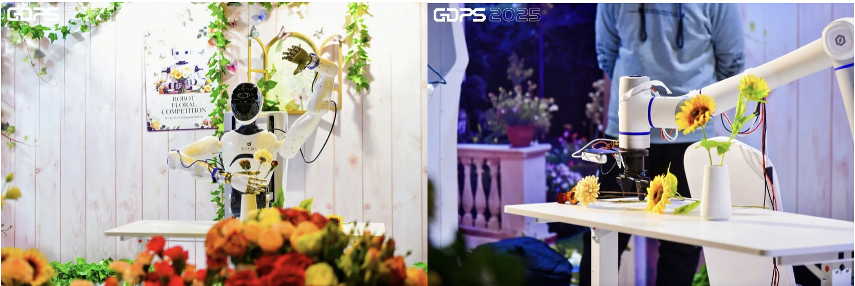 在现场,一台参赛机器人正按裁判要求有序完成插花步骤。机械臂的每一次移动都轻缓克制,甚至能听见花瓣被触碰时的细微声响。它先利用视觉系统对整个工作台进行扫描,再以毫米级精度完成抓取、旋转与插入动作。技术团队介绍,为解决花材易弯折变形、瓶口狭窄易滑落等难点,他们进行了大量训练与数据采集,通过持续优化算法,让机器人在柔性物体操作场景下具备更稳定的适应能力。最终呈现的作品层次清晰、结构稳定,也成为现场观众最常驻足拍摄的区域之一。
