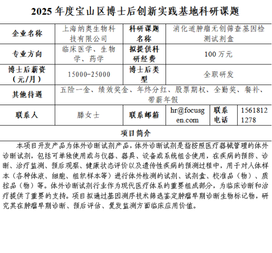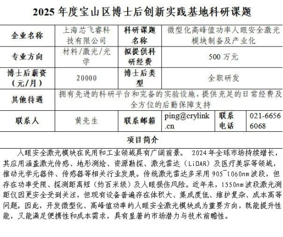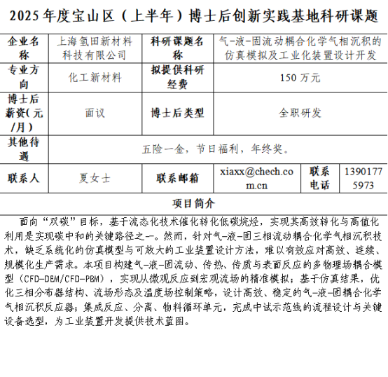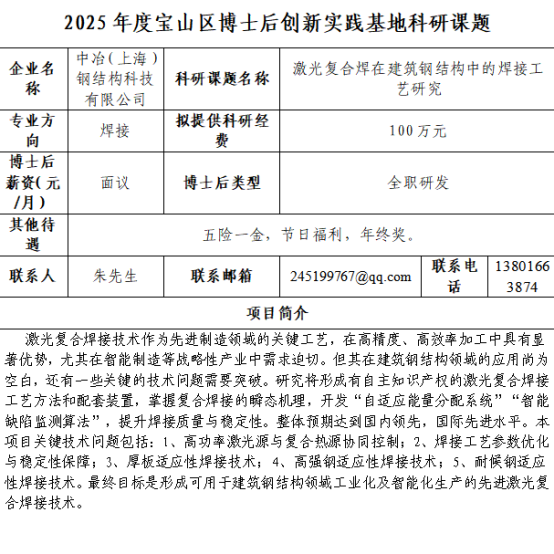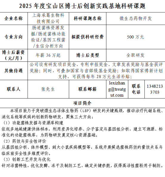 为进一步发挥博士后制度优势,有效推动我区企业开展科技攻关与产学研合作,宝山区人才工作局按照“2+N”模式,在2025年度宝山区博士后创新实践基地科研项目的征集活动基础上,经专家评审,并征求企业意见,本次区内共推出先进材料、生物医药、新一代信息技术等在内6个博士后科研项目及配套待遇,诚挚欢迎海内外高层次青年科研人才踊跃揭榜!具体情况如下: