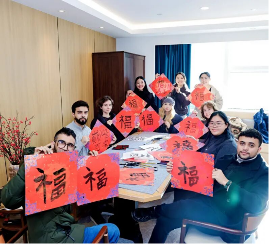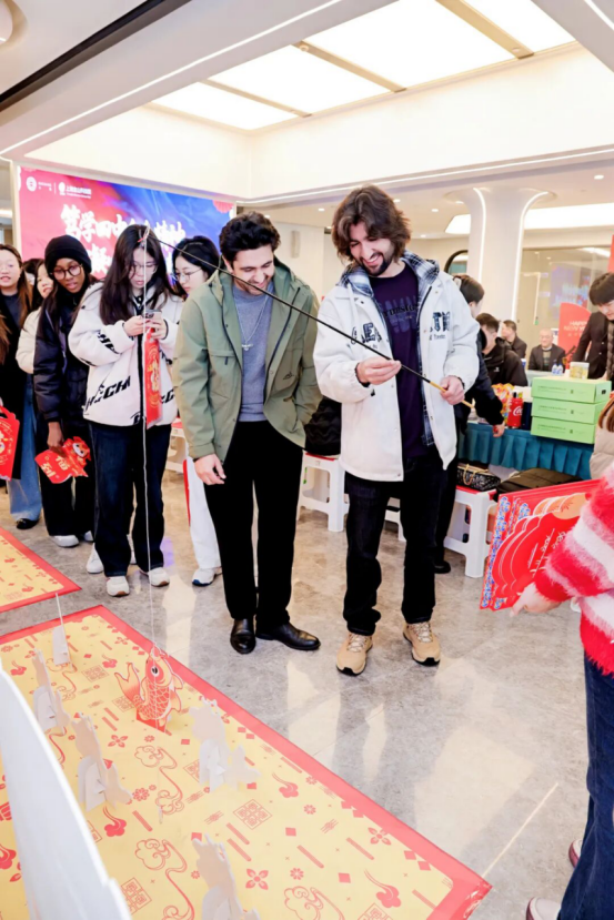 政策赋能与科创探索之外,一场充满中式韵味的文化盛宴为活动增添了浓厚的新年仪式感。趣味互动区内,元旦丢丢乐、上上签祈福、钓锦鲤赢好运等极具中国特色的小游戏轮番上阵,外籍学子们在轻松愉悦的氛围中尽情释放压力、收获惊喜,跨文化的友谊在欢声笑语中悄然升温。“翰墨迎新文化润园”环节中,书法老师手把手指导学子们书写“福”字,一笔一画间,学子们感受着汉字的独特魅力,也将新春的美好祝福藏进笔墨之中,让这份独特的新年记忆在宝山定格。