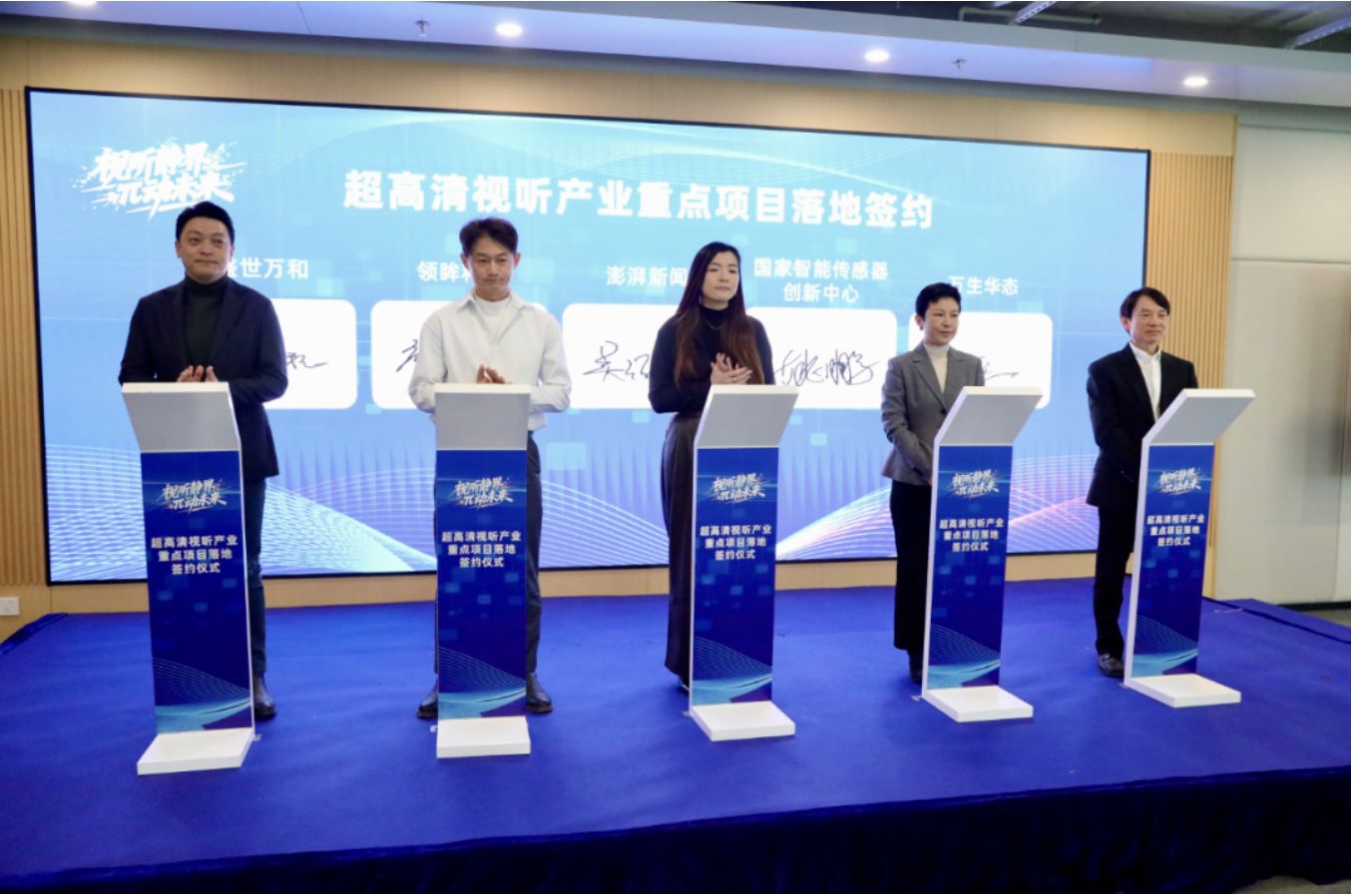 作为本次活动的重要成果之一,现场,超高清视听产业重点项目落地签约仪式举行。盛世万和SKYROAM大空间数字内容创制平台、领眸科技低空融媒项目、澎湃新闻多功能演播厅、国家智能传感器创新中心超芯感知创新空间、万生华态PBRMAX超高清创新中心等五个重点项目顺利完成签约。