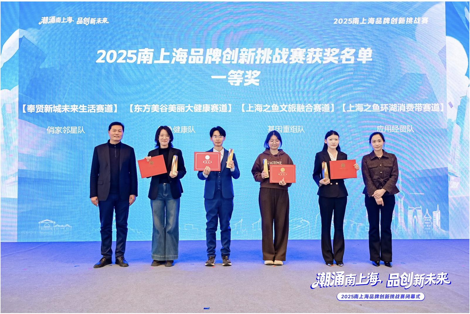记者了解到,本次品牌创新挑战赛由金海街道联合奉贤区工商联、现代服务业发展办公室等部门共同发起,旨在深入对接教育链、创新链与产业链,以青年创意赋能企业发展。赛事聚焦企业品牌经营发展痛难点,通过“政府搭台—企业出题—高校答题”的模式,设置奉贤新城未来生活赛道、东方美谷美丽大健康赛道、上海之鱼环湖消费带赛道、上海之鱼文旅融合赛道四大赛道,吸引12所院校的164支团队报名参赛,参赛选手均为“00后”,甚至不乏“05后”。从赛前集训、方案策划到实战运营,最终40支队伍经专家评审进入复赛,于去年12月完成决赛路演。闭幕式上,决赛成绩正式揭晓,高校代表上台领奖。