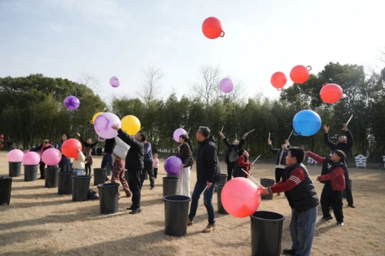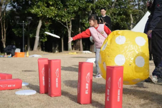 草坪上,有氧鼓和飞盘活动热闹非凡。大家组成战队,通过韵律互动释放压力、增强团队默契。
