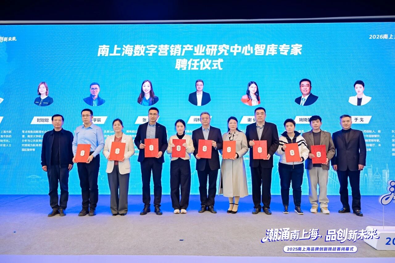 闭幕式上,南上海青年创新创业基地暨2026年青创研修营正式发布,同时,聘任首批“南上海数字营销产业研究中心”智库专家,汇聚学界与业界顶尖智慧,他们将为区域品牌建设的战略研究与人才培训提供长效智力支持。