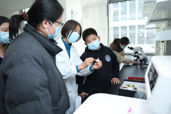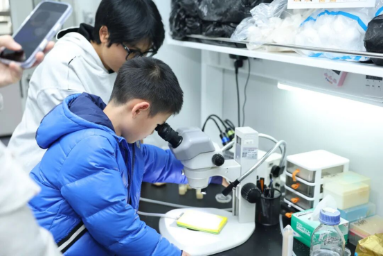 在趣味实践环节,“闵小才”们早已迫不及待跃跃欲试。在硫酸铜结晶艺术工坊,孩子们手持白纸花浸入硫酸铜溶液,亲眼见证晶体在花瓣上缓缓生长,将化学原理与美学创作完美融合,亲手打造出独一无二的“蓝水晶玫瑰”,定格永不凋零的科学之美。果蝇探秘营内,大家通过显微镜细致观察果蝇的性别差异与突变性状,在科研人员指导下尝试挑选雌雄果蝇配对,将微观世界的奇妙发现收入囊中作为纪念。石蜡包埋体验营里,从体式镜下取样、样品制备到石蜡包埋、微观观察,一套简化版的科研流程让孩子们亲身感受科研工作的严谨与乐趣,近距离触摸细胞世界的奥秘。“小镜头里的大乾坤”实验中,体视镜下新鲜植物的脉络纹理、显微镜下HE染色切片的细胞结构、荧光标记样品的奇幻色彩,逐一呈现在眼前,让孩子们在亲手操作中解锁观察世界的新视角。