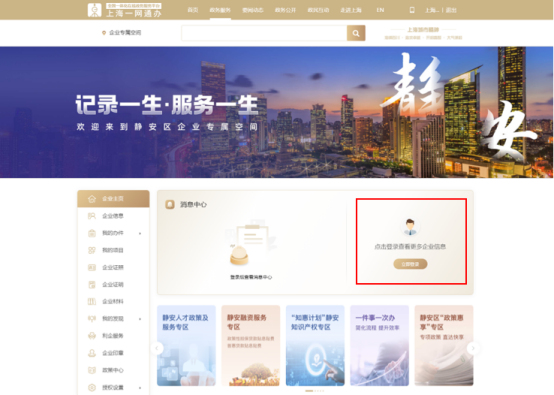 进入一网通办-静安区企业专属空间(https://zwdt.sh.gov.cn/qykj/shell_oc_ja/enterprise/eindex),点击【立即登录】。