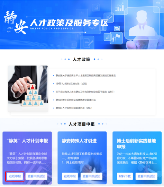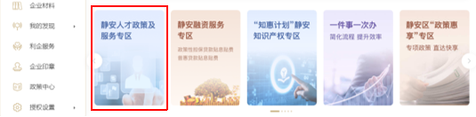 登录成功后,将自动跳转回到静安区企业专属空间,点击【静安人才政策及服务专区】。进入静安人才政策及服务专区,点击“‘静英’ 人才计划申报”一栏中的【在线申报】,即可进入静安人才综合服务平台主界面。