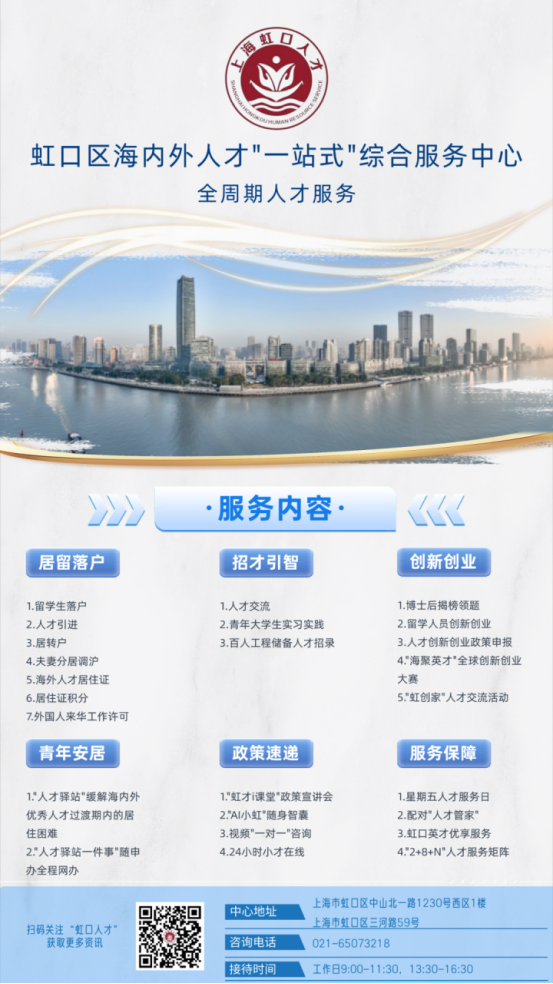 立足区域产业特色,以服务创新为抓手,全力打造便捷高效的“入住+入职+落户”人才服务体系,让人才在虹口安心安身安业。