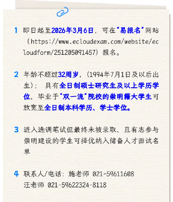 报考上海市崇明区2026年度选调生招录计划,进入选调笔试但最终未被录取、且有志参与崇明建设的学生可择优纳入储备人才面试名单。
