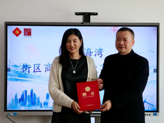 海湾旅游区社区党群服务中心党支部书记许立群向HEYOUMEI.赫悠美主理人兰会长颁发《海湾旅游区街区创业导师》聘书。