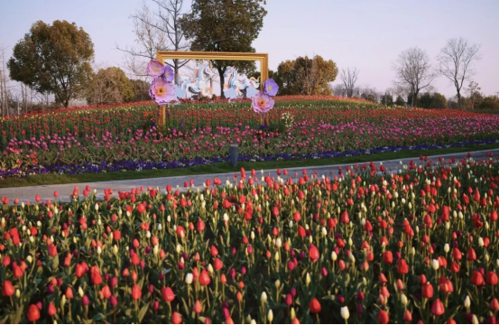 植树活动结束后,人才代表一行沿着花海步道步行至TOP中央公园花海区域,实地踏勘郁金香花海景观。这片占地14000平方米的花海,由18个品种、约59万株郁金香精心打造而成,五彩斑斓的花朵铺就成美丽的大地调色盘,成为春日里普陀的一道靓丽风景线。TOP中央公园如今已成为上海中心城区极具分量的城市“绿肺”,作为桃浦地区转型发展的核心生态工程,公园正积极发展“水流量”“乐流量”“花流量”三大特色板块,串联周边总部商务、科创园区与居民生活空间,全力打造市民喜爱的“城市微度假目的地”。
