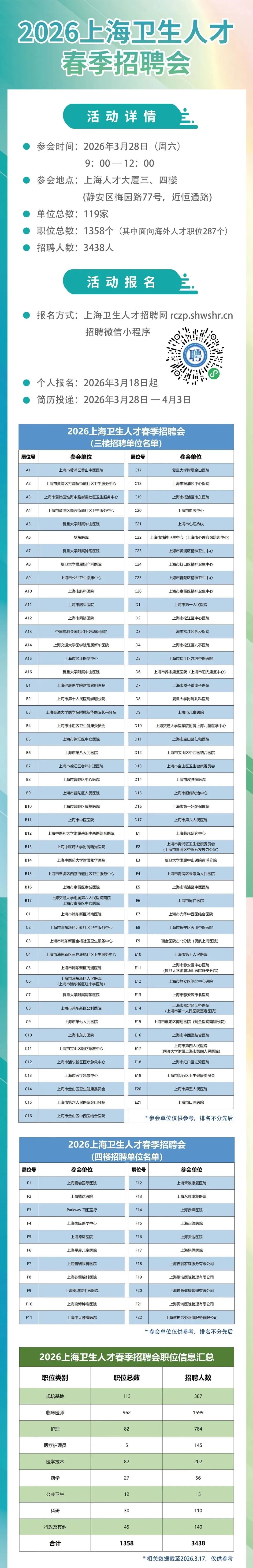 市卫生人才交流服务中心介绍,2026上海卫生人才春季招聘会将于3月28日(周六)9:00-12:00在上海人才大厦三、四楼举办。现已开始个人报名,求职者可通过上海卫生人才招聘网(rczp.shwshr.cn)或上海卫生人才招聘微信小程序报名。